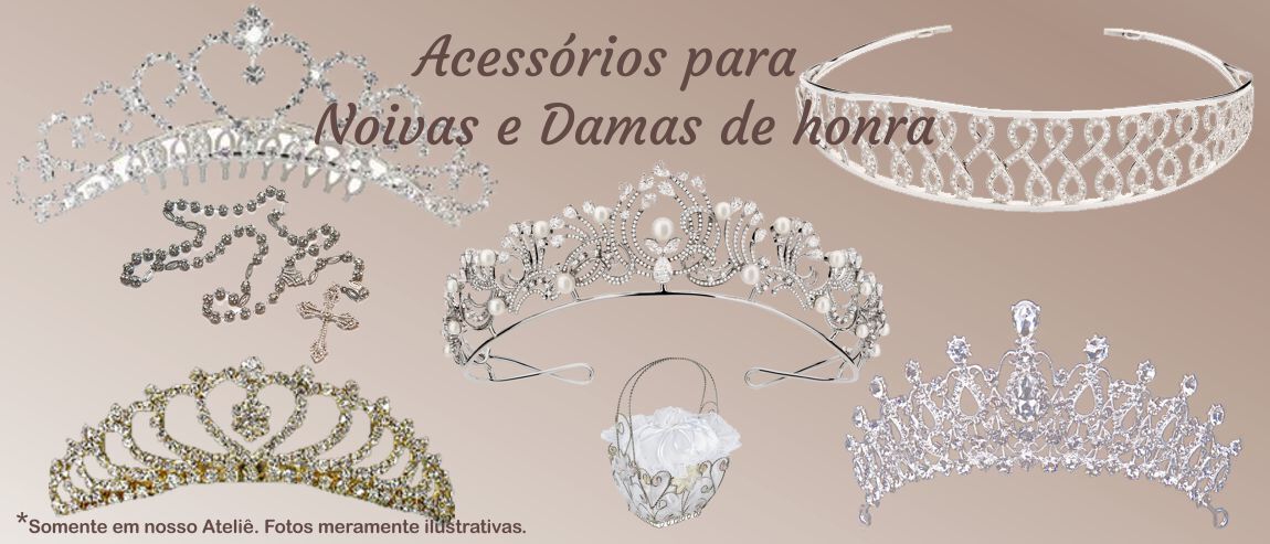 Coroas, tiaras, arranjos de cabeça, braceletes, véus, cestas para floristas, almofadinhas para aliançasAs tendências atuais apontam uma personalização das coroas, tiaras, arranjos de cabeças, apliques, grinaldas e os outros acessórios para noivas.Algumas são feitas especialmente para combinar com o desenho do rosto, tipo de cabelo, com os detalhes do bordado do vestido ou até mesmo para acompanhar as linhas do penteados ou do decote e também pode variar de acordo com o horário de cerimônia, que será assessorada pela melhor escolha do arranjo pelo nosso estilista.Os acessórios: arranjo de cabeça e véu acompanham juntamente com a Locação de: 1° e 2° Aluguel de Vestidos de Noivas e no 1° e 2° Aluguel dos Vestidos de Damas de honra acompanham a cesta para floristas, arranjo de cabeça e almofadinhas de porta alianças.AVISO IMPORTANTEOs acessórios acompanham juntamente com a Locação de vestidos de Noivas e ou vestidos de damas de honra.Não fazemos locações de acessórios separadamente.Não fazemos locação de calçadosFormas de Pagamento: Somente em DINHEIRO ou PIX.
